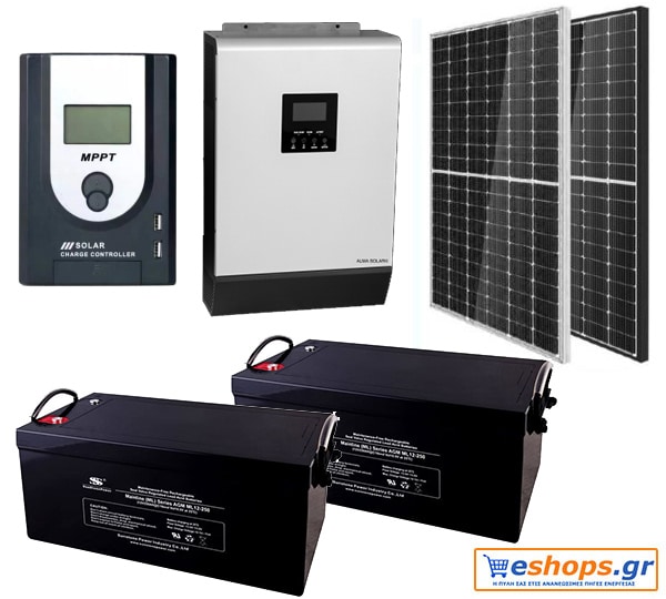 Οικονομικό αυτόνομο Φωτοβολταϊκό για Ψυγείο, Πλυντήριο (900 watt), TV συνολικής απόδοσης 6000Wh( ανά 24ωρο τους καλοκαιρινούς μήνες) Οικονομική σειρά. Αποθήκευση με  2 μπαταρίες  x 220/250ah ( έως 3Kwh-Αποθήκευση)