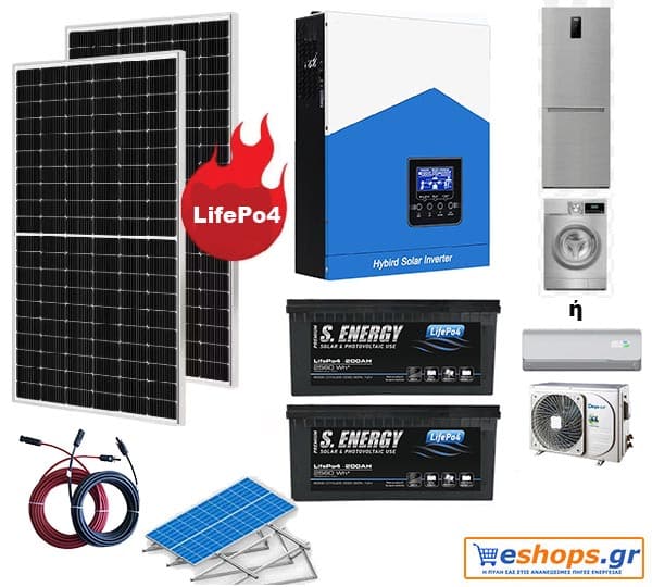 Αυτόνομο Φωτοβολταϊκό 4.8- 5.5kwh με μπαταρίες λιθίου LifePo4 για (ψυγείο, πλυντήριο ή Κλιματιστικό, φωτισμό, TV,  μικροσυσκευές)