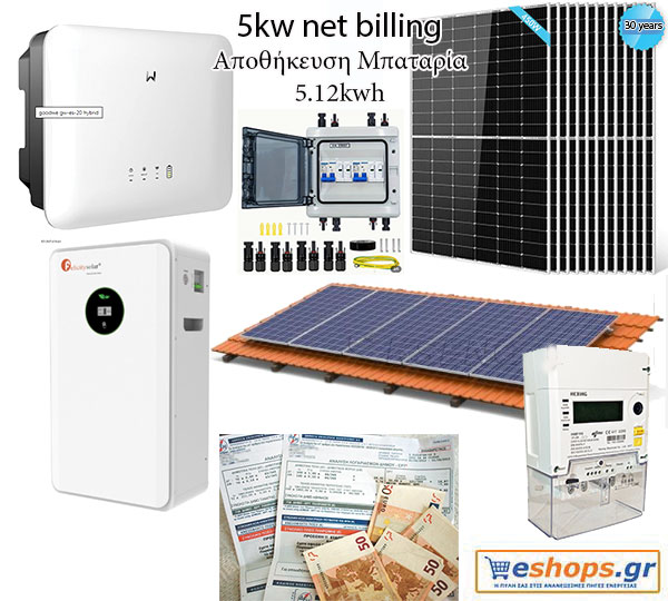 5kw με μπαταρία 5,12kwh net billing υβριδικό inverter Goodwe GW5000-ES-20 HYBRID(DC-SWITCH/WIFI/1P-METER)  Φωτοβολταϊκό net Billing ταυτοχρονισμένου συμψηφισμού (αυτοπαραγωγής) με δυνατότητα αποζημίωσης της πλεονάζουσας ενέργειας (με τιμές χονδρικής).