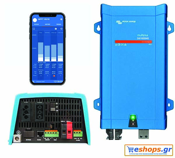 Victron MultiPlus 24/1600/40-16 μετατροπέας – inverter DC – AC καθαρού ημιτόνου με φορτιστή 40A DC και ρελέ μεταγωγής 16Α. O MultiPlus νέου τύπου σκοπό έχει να αντικαταστήσει την προηγούμενη σειρά MultiPlus Compact. Είναι ένα ισχυρό inverter καθαρού ημιτόνου και ένας εξεζητημένος φορτιστής μπαταριών με τεχνολογία προσαρμοζόμενης φόρτισης καθώς και ένας υψηλής ταχύτητας διακόπτης μεταφοράς εναλλασσόμενου ρεύματος, όλα σε ένα συμπαγές μεταλλικό πλαίσιο.